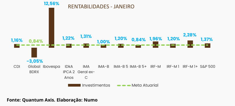 Em síntese, o mês de janeiro foi marcado por forte valorização da renda variável brasileira, enquanto os ativos de renda fixa mais conservadores continuaram a apresentar desempenho consistente e alinhado à meta atuarial.