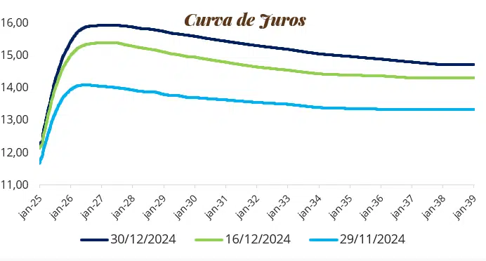 Em relação à inflação, o IPCA-15, prévia da inflação oficial do país, teve alta de 0,34% em dezembro, vindo abaixo do esperado pelo mercado (0,45%). O acumulado em 2024 foi de 4,71%, ficando acima da margem de tolerância da meta de inflação perseguida pelo Banco Central. Dos nove grupos que compõem o indicador, cinco apresentaram alta no mês, com o destaque sendo para Alimentação e bebidas, que variou 1,47% e impactou o índice geral em 0,32 p.p..