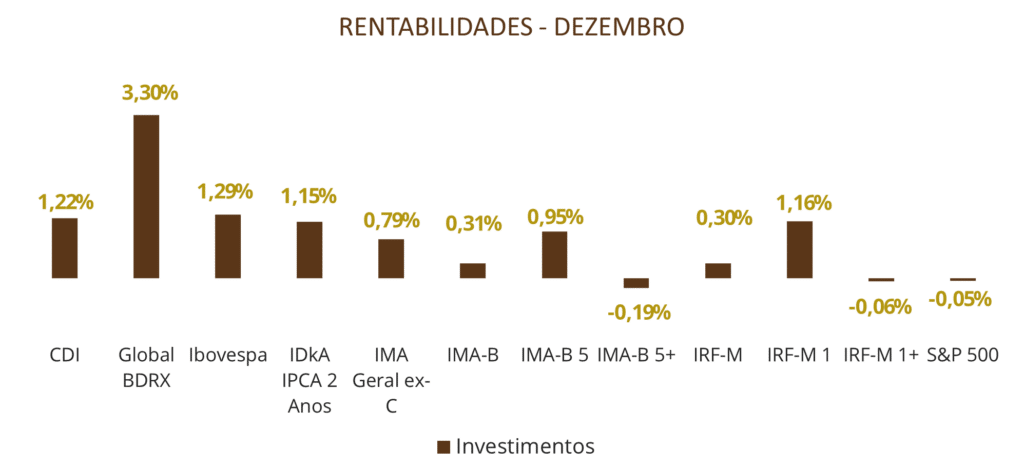 Em suma, o mês de dezembro foi marcado por forte alta dos Brazilian Depositary Receipts (BDR) e da bolsa brasileira, enquanto ativos de renda fixa mais conservadores permaneceram com desempenho consistente.