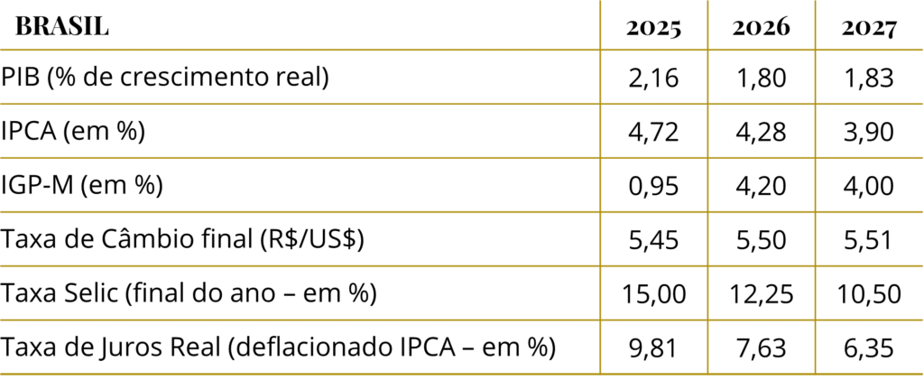 A economia brasileira mostrou perda de fôlego no terceiro trimestre, com enfraquecimento da atividade, inflação em alta e Selic mantida em 15%. No exterior, os Estados Unidos apresentam sinais de desaceleração, com mercado de trabalho mais fraco e início do ciclo de cortes de juros. A zona do euro mantém ritmo moderado de crescimento e inflação próxima da meta, enquanto a China mostra leve recuperação da atividade e estabilidade na taxa de juros.