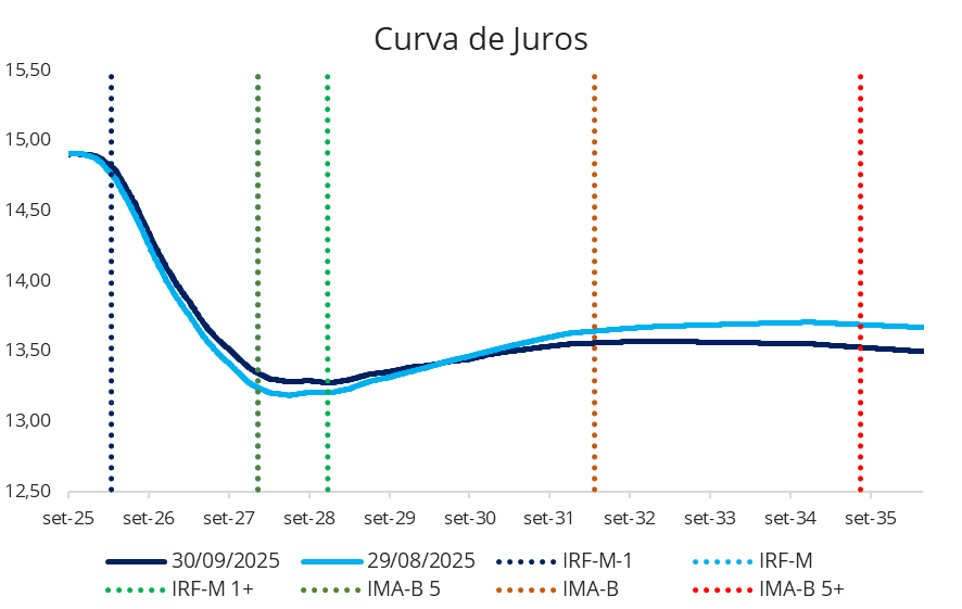 Em setembro, a inflação e as expectativas permanecem desancoradas, o que limita o espaço para um alívio mais consistente nos prêmios de risco. Assim, a parte curta da curva permaneceu estável, ancorada pela expectativa de manutenção da Selic em patamar elevado, reforçando o caráter ainda restritivo da política monetária.