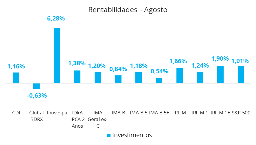 O mês de agosto apresentou, de forma geral, um desempenho positivo para a maior parte dos ativos, com destaque para a expressiva alta do Ibovespa, que encerrou o mês com valorização de 6,28%.