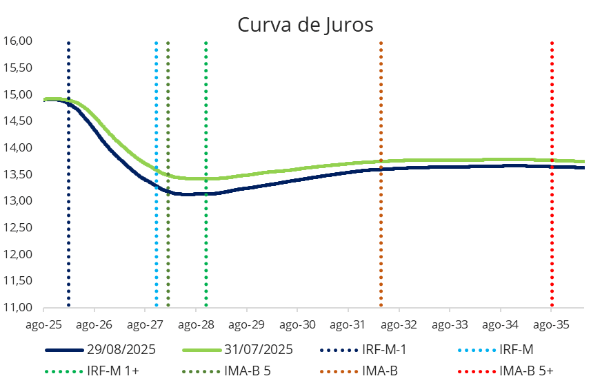 Em agosto, a curva de juros apresentou comportamento semelhante ao do mês anterior, porém com movimentos mais contidos e concentrados nos vértices intermediários. Observou-se um fechamento parcial das taxas ao longo da curva, mas com maior intensidade em vértices intermediários, enquanto os prazos mais longos permaneceram praticamente estáveis.