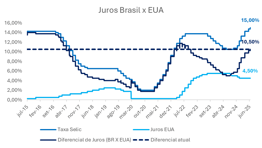 Neste contexto de manutenção de juros nos EUA, enquanto observamos novas altas no Brasil, o diferencial de taxa de juros entre os países, atualmente em 10,50 pontos percentuais, encontra-se em patamar superior à média histórica observada entre 2017 e 2025.