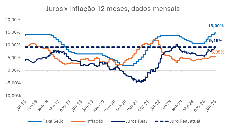 Neste cenário, o Comitê de Política Monetária (Copom) optou por manter uma abordagem contracionista. A taxa Selic, que finalizou 2024 em 12,25%, chega ao final de junho em 15%, o que ocasionou durante o intervalo de progressão dos aumentos uma das maiores taxas de juros reais do mundo, chegando a 9,16%.