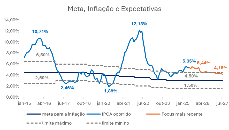 Os impactos nos mercados também refletiram a mudança nas perspectivas quanto à trajetória da taxa Selic. Segundo o Boletim Focus divulgado em 27 de junho, a projeção para a Selic ao final de 2025 permanece em 15,0%, mesmo patamar da taxa atual. Para 2026 e 2027, as expectativas apontam para uma queda gradual, recuando para 12,5% e 10,5%, respectivamente.