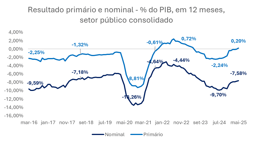 No campo fiscal, após sucessivos trimestres de deterioração e da tentativa do governo em buscar o equilíbrio das contas públicas especialmente por meio de ajustes nas receitas, o setor público consolidado registrou superávit primário de 0,20% do PIB em 12 meses, de acordo com dados do Banco Central referentes ao mês de maio. O resultado nominal, por sua vez, segue em trajetória significativamente negativa, alcançando -7,58% do PIB, pressionado pelo custo crescente do serviço da dívida.