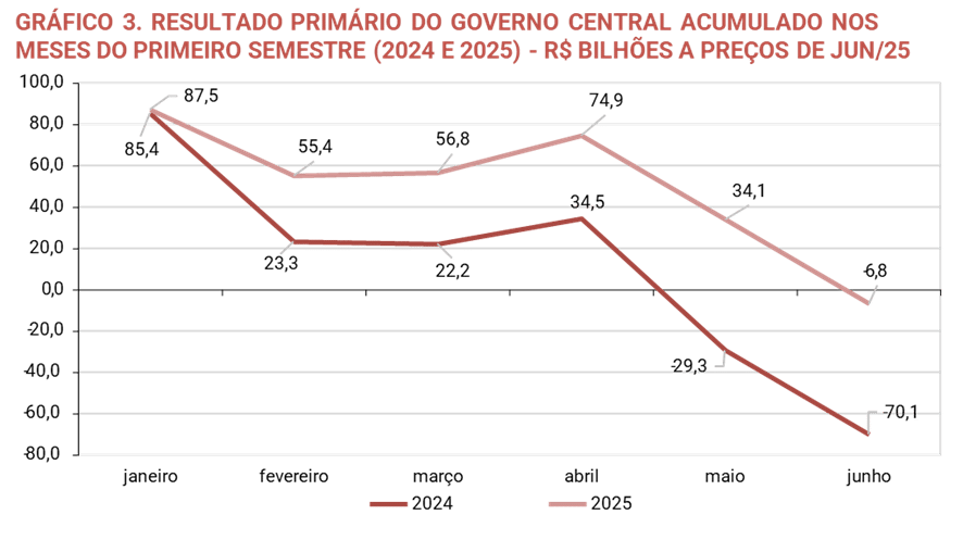 De acordo com Relatório de Acompanhamento Fiscal da Instituição Fiscal Independente (IFI), “A tendência de atenuação do desequilíbrio fiscal é confirmada pela apuração do déficit primário corrente, que registrou queda de 2024 para o presente ano. Os dados precisam ser analisados com cautela, visto que o orçamento da União para 2025 só foi aprovado em março, levando a um natural represamento da execução orçamentária.”
