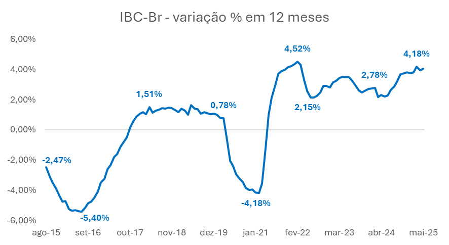 Em relação à atividade econômica, os dados mais recentes do IBC-Br, proxy mensal do PIB, mostram que a economia brasileira mantém trajetória de crescimento, apesar de sinais de desaceleração. A variação acumulada em 12 meses atingiu 4,18% em maio de 2025, acelerando desde meados do ano passado e consolidando a tendência positiva.