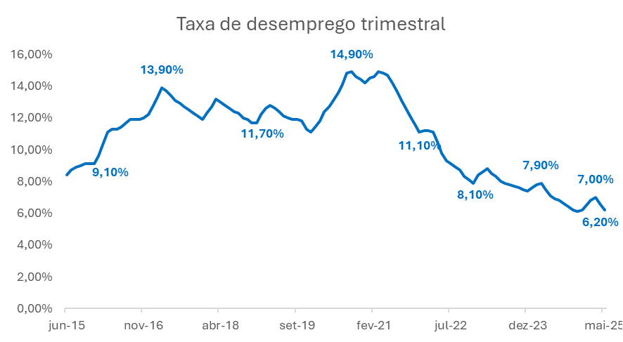 Esse aquecimento da atividade encontra respaldo também no mercado de trabalho. A taxa de desemprego medida pela PNAD Contínua recuou para 6,2% no trimestre encerrado em maio. Esse é o menor patamar da série histórica para o período e reflete não apenas a criação líquida de vagas, mas também o aumento da população ocupada, que atingiu novo recorde. O mercado de trabalho aquecido contribui para pressionar positivamente reajustes salariais e sustentar o consumo das famílias, sustentando a expansão da atividade no curto prazo.