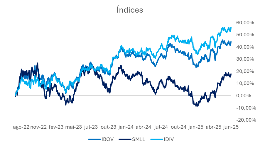 O gráfico a seguir evidencia a trajetória dos principais índices da bolsa brasileira nos últimos três anos. Observa-se uma performance mais consistente de empresas consolidadas e com histórico de distribuição de dividendos, como é o caso das que compõem o IDIV, que manteve uma trajetória mais positiva ao longo do período.