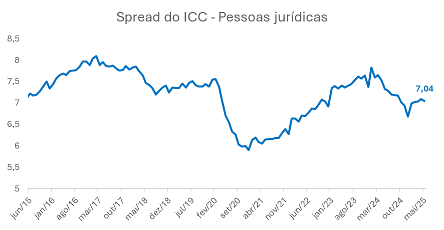 No mercado de crédito privado, o spread do Índice de Custo de Crédito (ICC) para pessoas jurídicas, que representa a diferença entre o custo de captação das instituições financeiras e a taxa efetiva cobrada no empréstimo às empresas, atingiu 7,04 pontos percentuais em abril de 2025, conforme mostra o gráfico. Após uma trajetória de queda entre fevereiro e dezembro de 2020, impulsionada pelo contexto da pandemia, os spreads voltaram a subir com o ciclo de alta da Selic iniciado em 2021.
