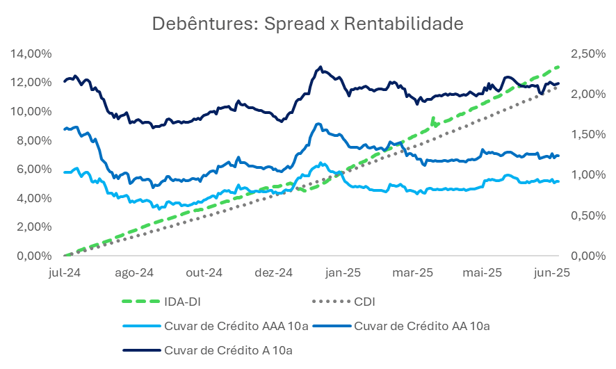 O gráfico a seguir apresenta a evolução do IDA-DI e do CDI (eixo direito), além dos spreads de crédito de debêntures com ratings AAA, AA e A (eixo esquerdo).