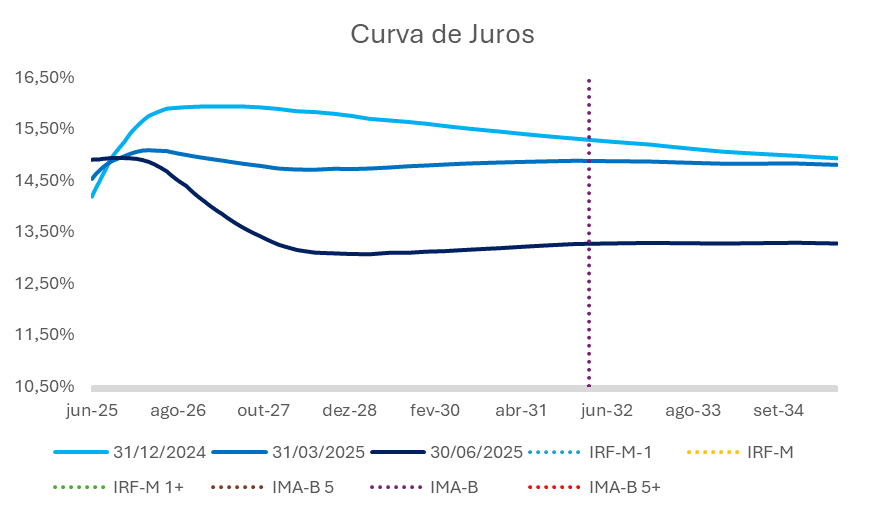 Os acontecimentos ao longo do semestre foram refletidos na curva de juros, que se alterou entre dezembro de 2024 e junho de 2025. Em dezembro, a curva apresentava taxas longas próximas de 15,5% para vencimentos entre 3 e 5 anos. No primeiro trimestre de 2025, a curva começou a arrefecer, com destaque para o fechamento nos vértices intermediários sinalizando início de melhora nas expectativas para os juros futuros. Essa tendência se intensificou até o final de junho, quando a curva apresentou fechamento mais expressivo, especialmente nos vértices intermediários (3 a 5 anos) e longos (até 10 anos), com taxas próximas a 13,5% para os vencimentos de 2034.