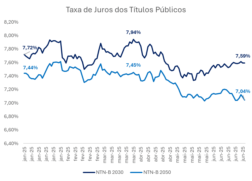 Durante o primeiro semestre de 2025, apesar de elevada volatilidade nas taxas reais dos títulos públicos atrelados à inflação, as NTN-Bs continuaram a apresentar taxas atrativas. O título com vencimento em 2030 iniciou o ano com taxa real em torno de 7,72% a.a., atingiu pico de 7,94% em março e recuou para 7,59% em junho. A NTN-B 2050 teve trajetória semelhante, variando de 7,44% a.a. para 7,45% e 7,04% no período.