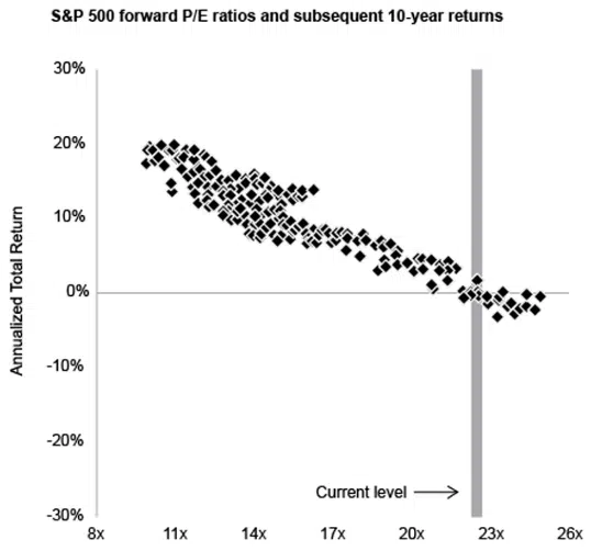 Na mesma carta, o economista destacou o gráfico abaixo, da J.P Morgan Asset Management, que mostra a relação inversa entre o índice preço/lucro (P/E) do S&P 500 e o retorno anualizado do índice nos 10 anos seguintes, com base em dados mensais de 1988 a 2014. Ele revela que valuations iniciais elevados (P/E altos) geralmente resultam em retornos futuros menores, enquanto valuations baixos tendem a indicar maiores oportunidades de ganho.