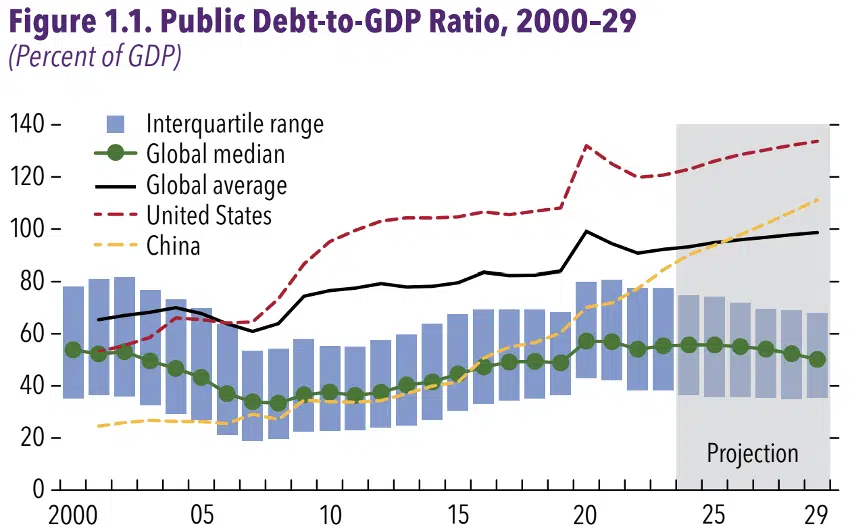 Em um contexto em que os governos, em geral, já estão bastante endividados, há um risco fiscal potencial nessa segregação global, especialmente pelo possível dispêndio que os governos terão para auxiliar alguns setores. Segundo o FMI, “os déficits fiscais e as dívidas superam as projeções pré-pandemia e a previsão é que continuem mais altos no médio prazo. Sem medidas firmes, a dívida pública mundial deve ultrapassar 100% do PIB até 2029.” (gráfico a seguir)