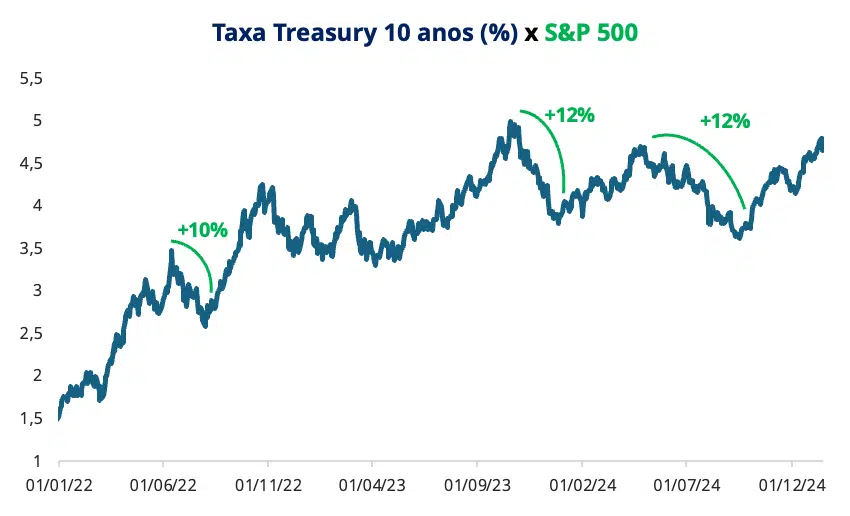 Os percentuais (em verde) indicam a valorização dos índices S&P 500 nos períodos destacados em que houve redução da taxa de juros do título de 10 anos (em azul)